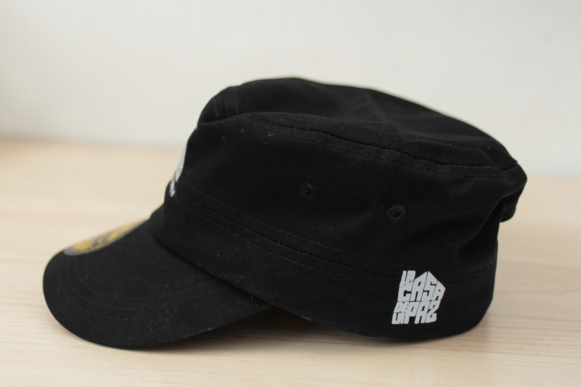 Gorra estilo militar bordada con el logo de la trocha y el logo de la casa de la paz al lado derecho, color negro y verde oliva
